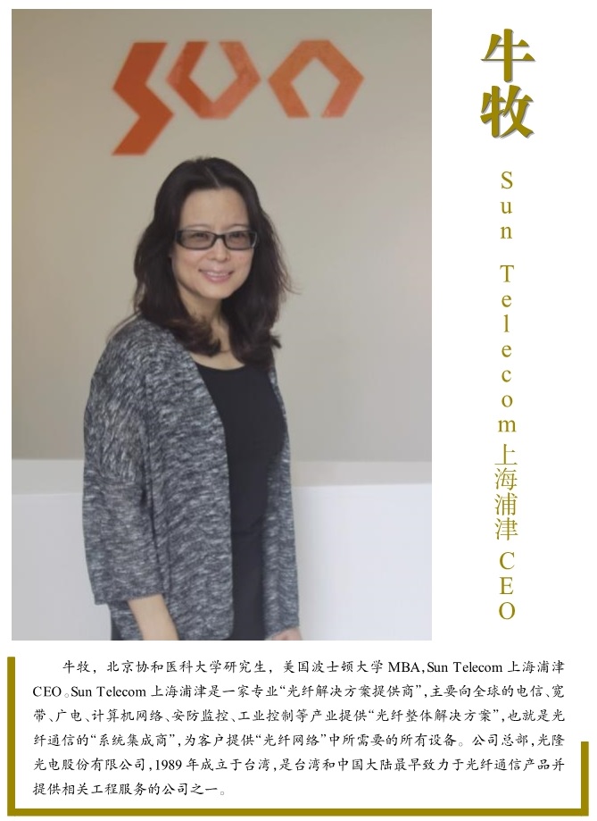 牛牧,Sun Telecom上海浦津CEO。Sun Telecom上海浦津是一家专业“光纤解决方案提供商”,主要向全球的电信、宽带、广电、计算机网络、安防监控、工业控制等产业提供“光纤整体解决方案”,也就是光纤通信的“系统集成商”,为客户提供“光纤网络”中所需要的所有设备。Sun Telecom上海浦津,以“最大程度地满足客户对光纤通信的需求”为服务宗旨,为全球光纤通信市场提供光纤通信整体解决方案和产品。迄今为止,Sun Telecom上海浦津的客户已遍布全球100多个国家和地区,涉及领域包括电信、有线电视和广播、安防监控、计算机网络、工业控制和工业激光等。